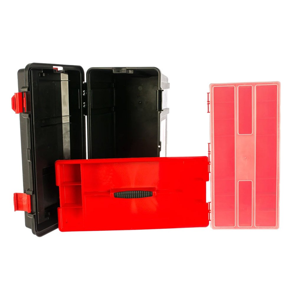 Ящик для инструментов с лотком и органайзером Tayg TAY-133008 имеет удобное общее отделение для хранения инструментов, сменный лоток для деталей и приспособлений среднего размера, а также съемный органайзер для хранения метизов и мелких запчастей.