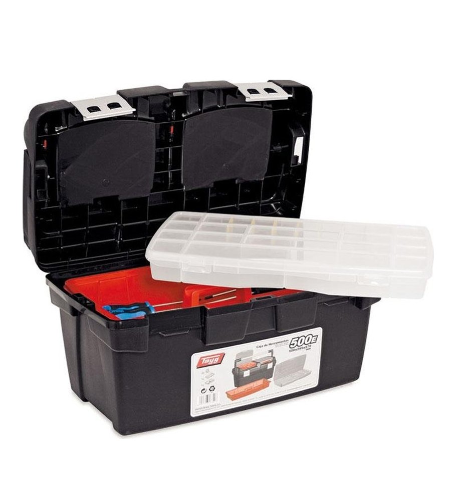 Ящик для инструментов 166006 TAYG с лотоком и органайзером подойдет для переноски и хранения большого количества ручного инструмента. Наличие лотка для мелочей создает дополнительное пространство для крепежа. В крышку ящика встроены 2 органайзера. Два металлических замка, что обеспечивает сохранность содержимого во время транспортировки надежно закрывают ящик. Эргономичная рифленая складная рукоять повышает удобство транспортировки. Выполнен из морозоустойчивого пластика, поэтому не подвержен коррозии.
