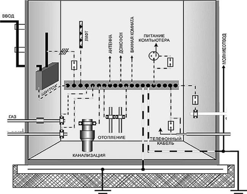 Именно на этом принципе основано действие системы уравнивания потенциалов (СУП). Основная система СУП на вводе в многоквартирный дом, это, в своей основе, медная шина, к которой подходят проводники от труб отопления и водоснабжения, от газа и канализации (если они из металла), от стальных оболочек питающих здание кабелей, а также заземляющие проводники от главной заземляющей шины.