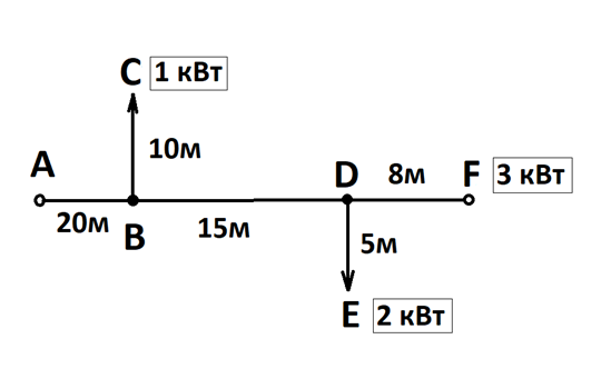 Для примера, возьмём разветвлённую линию ABCDEF (см. схему выше). Она состоит из трёх контуров, в пределах которых сила тока (и проходящая мощность) не изменяются: «куски» магистрали AB, BD, DF и ответвления BC и DE. Для каждого из этих контуров нужно рассчитать момент мощности M.
